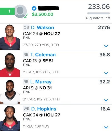 - All three winners featured Murray ( week 8 NwN play), Mike Evans and week 8 super stud Tevin Coleman. If you didn’t have this combination you didn’t win. Coleman was lighting in a bottle, but both Murray and Evans were heavily featured in games that were predicted to be high scoring.