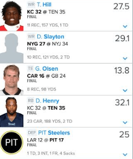Onto the winners! I am only featuring one winning line-up this week because it was good enough to win multiple Fanduel GPP tournaments. Analyzing his winning line-up, we will deconstruct his roster build and use the lessons learned to build our own optimal line-up for week 11.