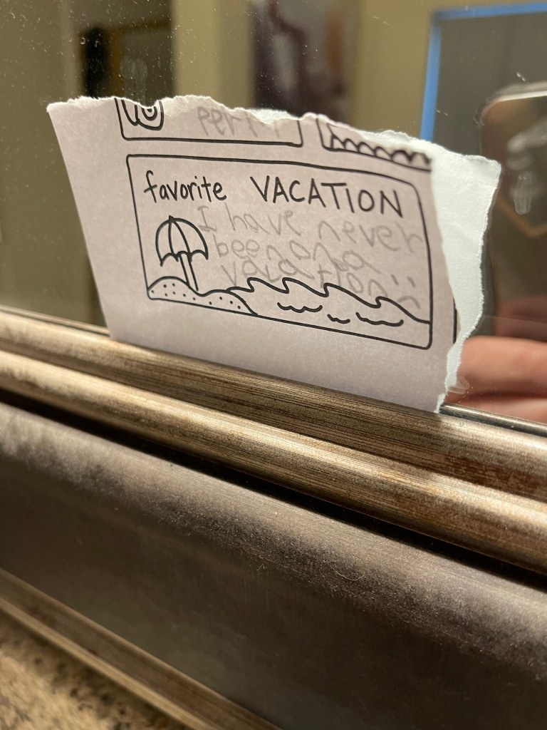 We were shuffling through Addison’s school folder last night and found an assignment where the students were asked about some of their favorite things. Our child waxed poetic of her love for animals and video games, but the one that hit us like a ton of bricks was the one about her “favorite vacation.” Our eight-year-old wrote in pencil, “I have never been on a vacation” with a sad face at the end. Kristina and I both replicated the face to one another. It hurt. The little cartoon beach with waves, sand, and an umbrella had stirred up that resentment in our little girl. She didn’t know we were going to see this. Now, we’re not going to ignore it.