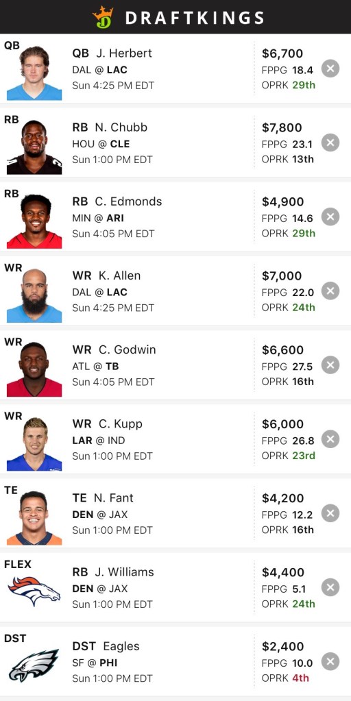Trevor Lawrence and the Jacksonville Jaguars offense’s lone bright spot this season has been free agent Marvin Jones. Jones is leading the team in targets, receptions, touchdowns, and DraftKings points. He’s currently priced $400 less than D.J. Chark, who only has four catches on 16 targets.